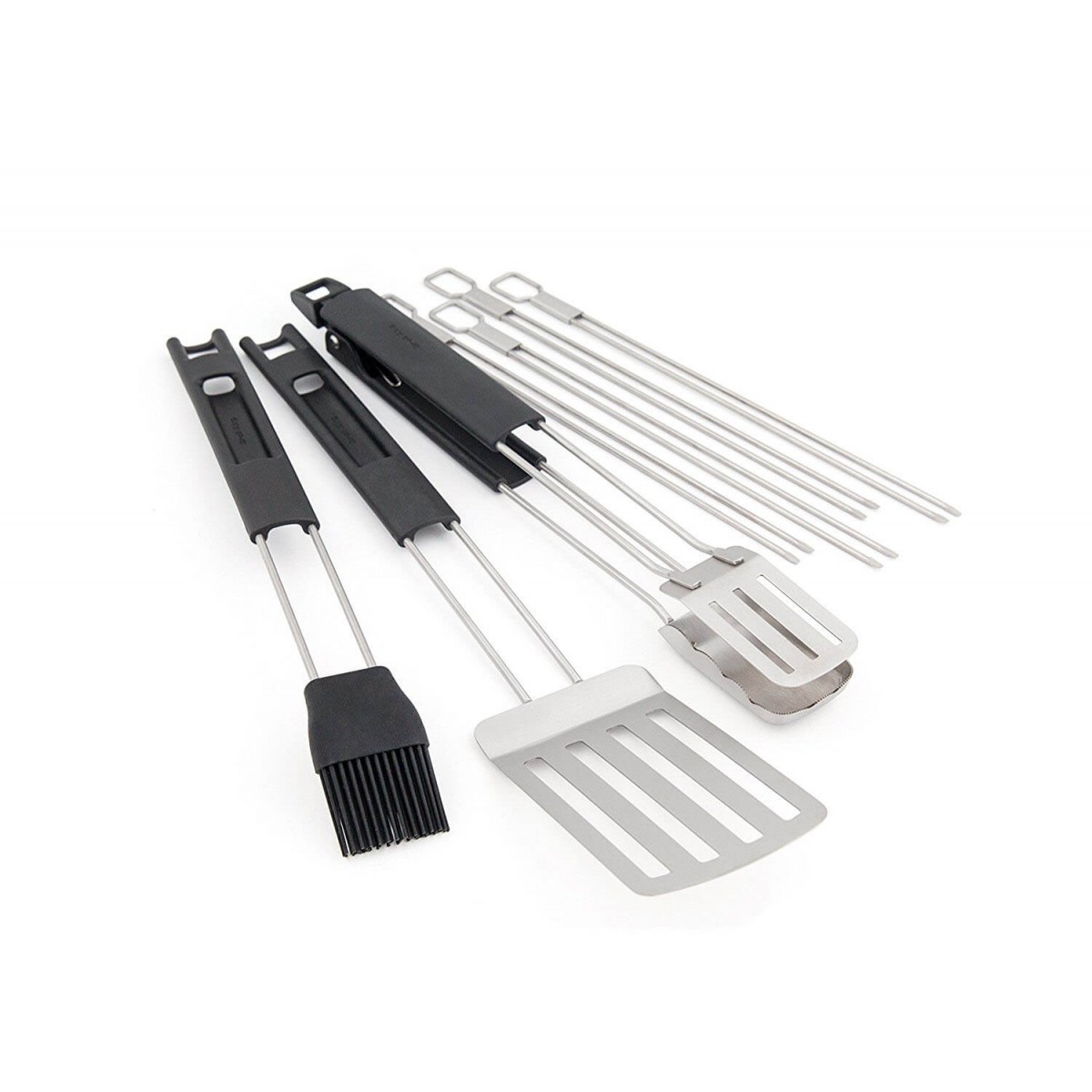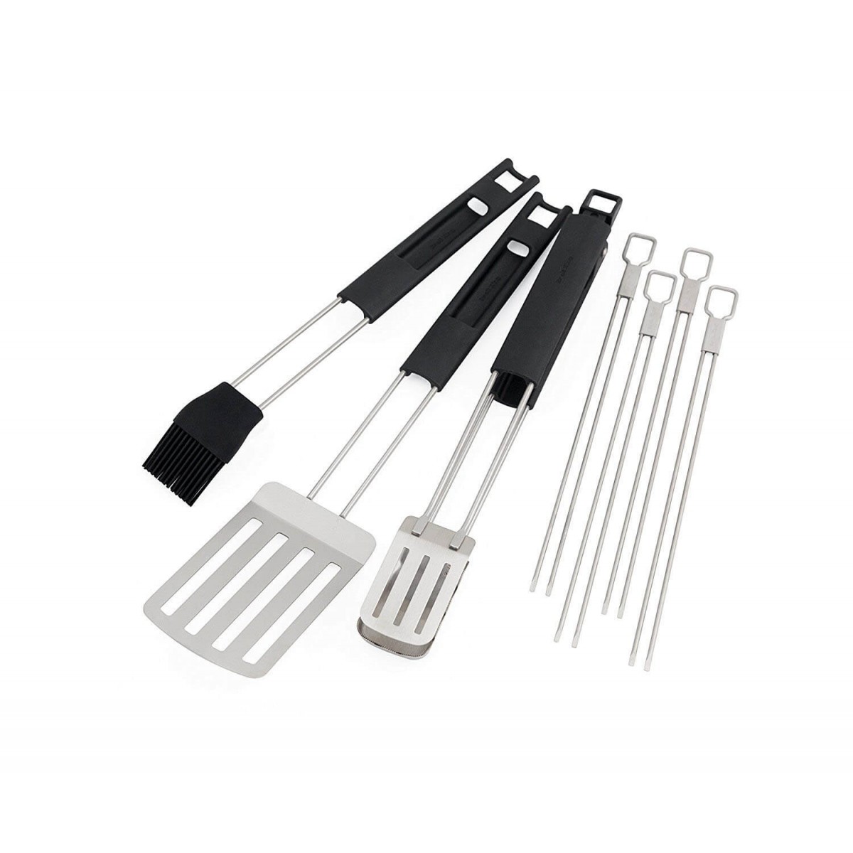 Набор инструментов из 7 предметов Broil King из нержавеющей стали. В набор входит лопатка, щипцы, кисточка для смазывания, 4 шампура. Ручки нескользящие, прорезиненные.Основные характеристики