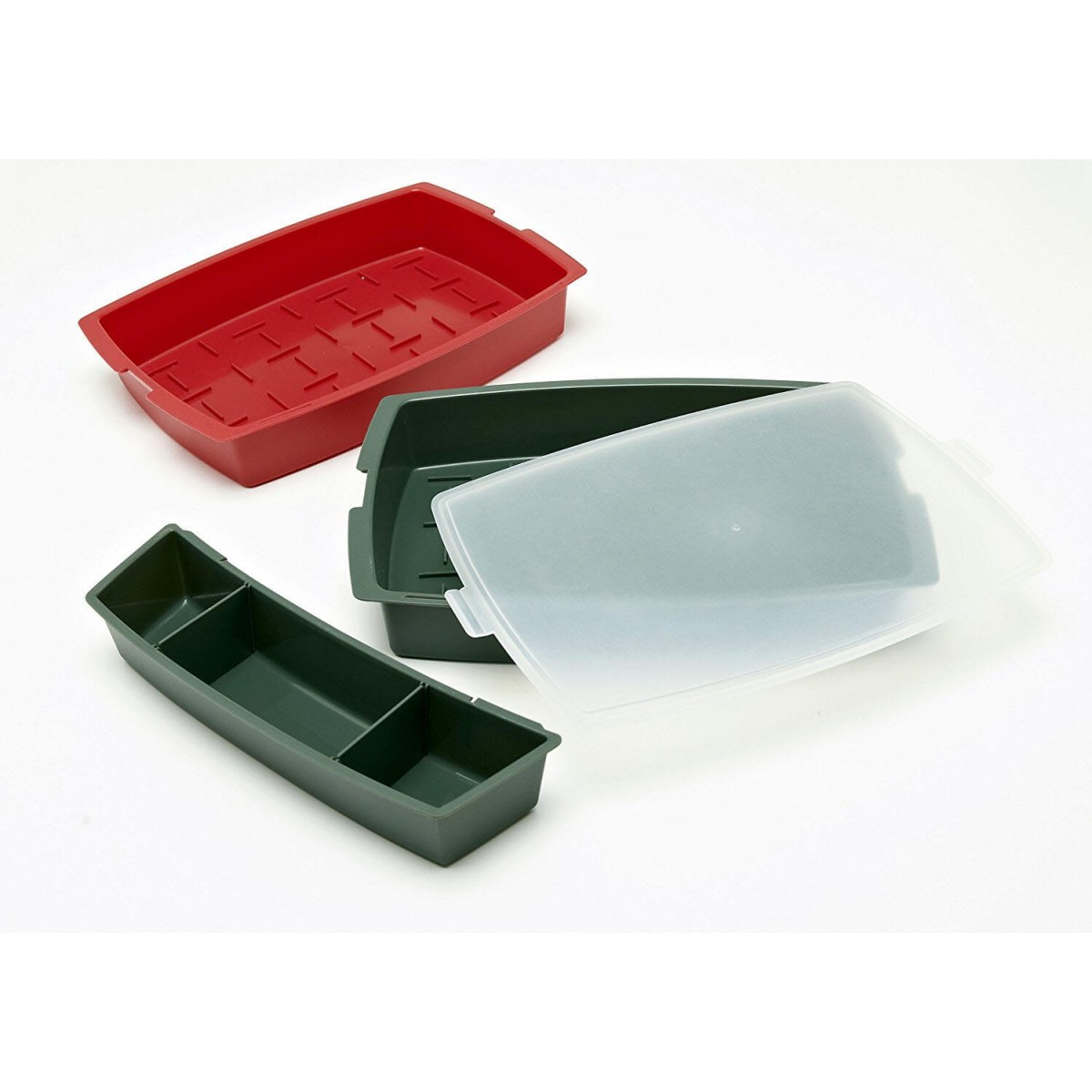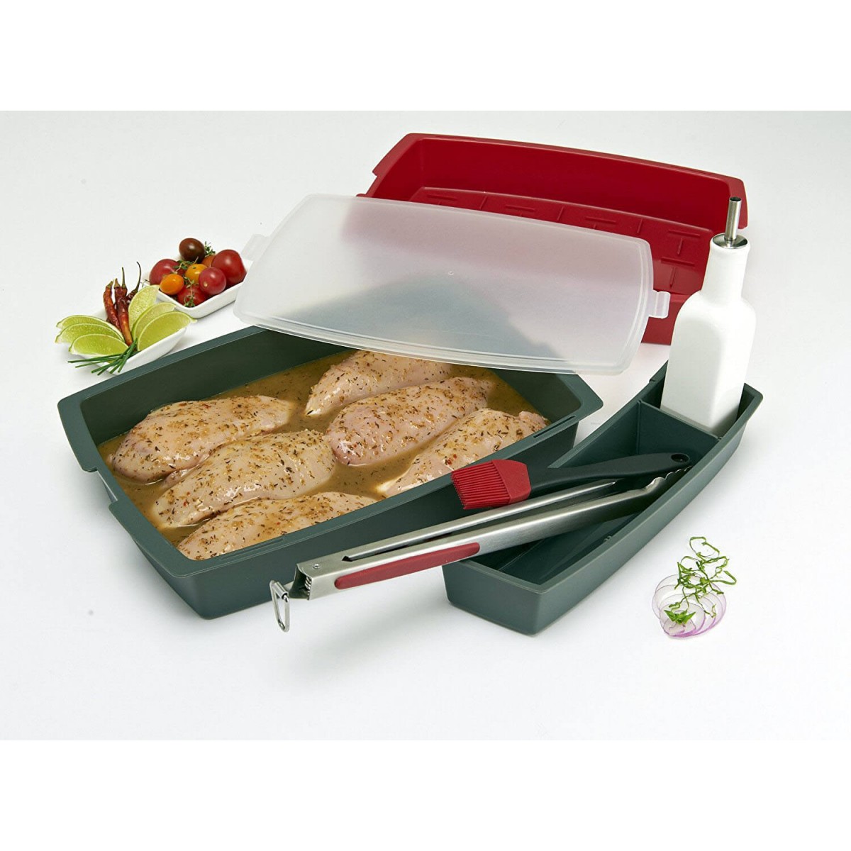 Два удобных контейнера - красный и черный, для сырых и приготовленных продуктов. Пластиковые ребра внутри каждого контейнера позволяют лучше промариновать продукт. В комплект есть контейнер для приправы и одна крышка.Основные характеристики
