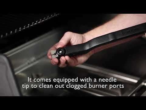 1. Когда гриль полностью остыл, снимите горелку и осмотрите ее порты. Если они засорились, почистите их мягкой щеткой. Можно также вычистить любые загрязнения, проткнув засоры канцелярской кнопкой (или другим мелким инструментом; никогда не используйте дрель или напильник – деформировав отверстия, Вы повредите горелку).